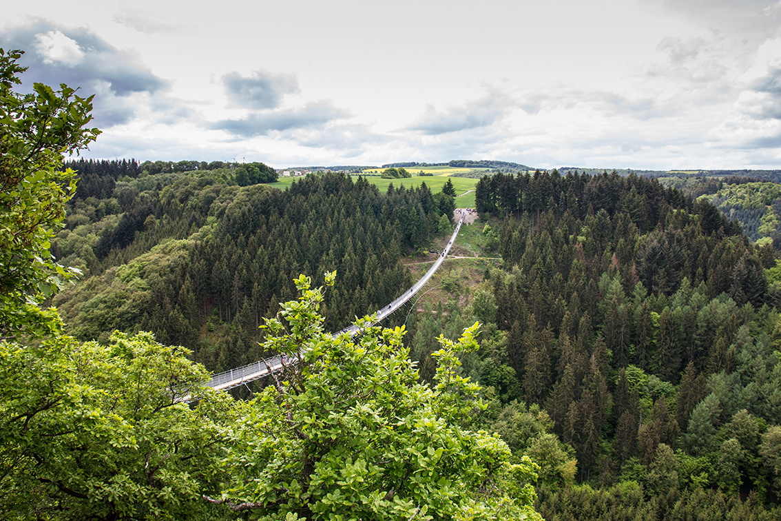 Wage den Spaziergang über die spektakuläre Geierlay Hängeseilbrücke, eine der längsten Fußgängerbrücken Deutschlands. Genieße den Nervenkitzel und die atemberaubende Aussicht auf die Landschaft.